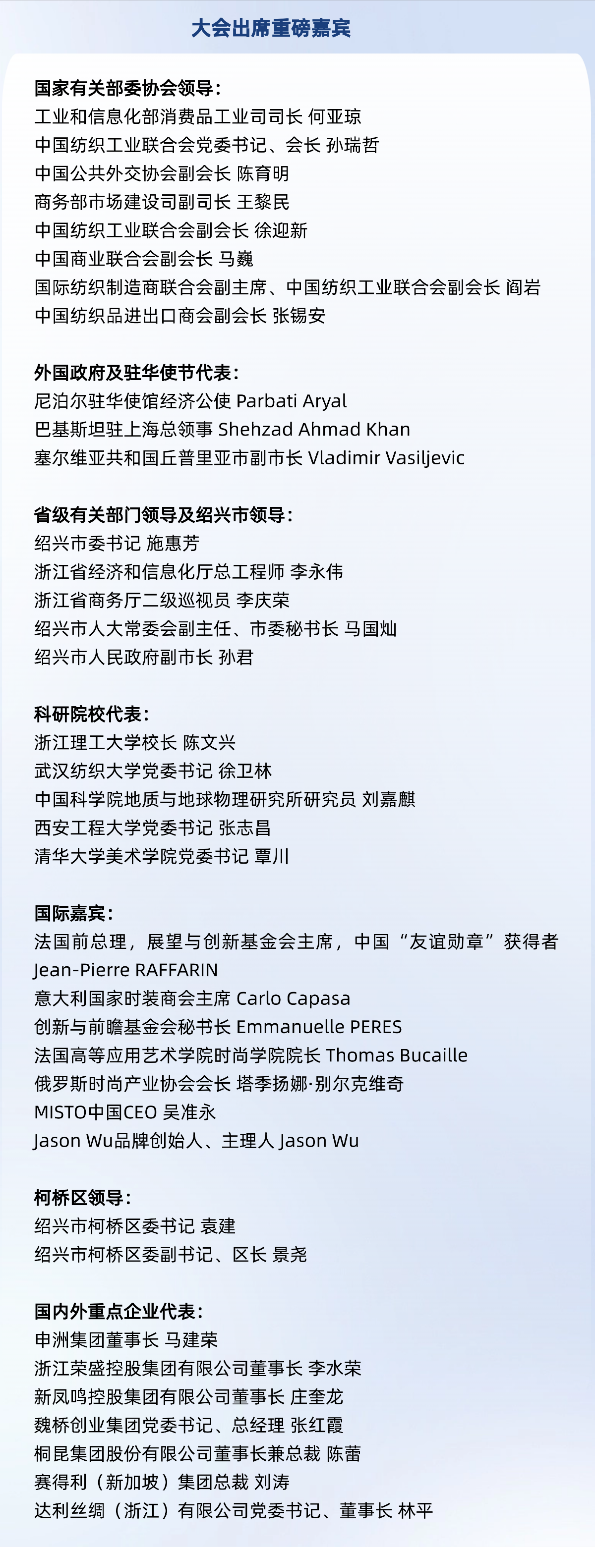 “近年來,紹興不斷厚植‘產業+市場+科創’核心優勢,著力構建原料端、制造端、貿易端、服務端一體貫通的現代紡織生態。”施惠芳在致辭中表示,紹興將把紡織產業煥新升級擺在更加重要的位置,深刻把握全球紡織價值鏈多維重構的重大機遇,堅持科技、數字、文化、綠色、市場、共富多維度賦能,依托創新平臺攻關核心技術,運用智能制造賦能全產業鏈,完善綠色標準體系,整合全球資源,全力打造紡織共享經濟、共富經濟。