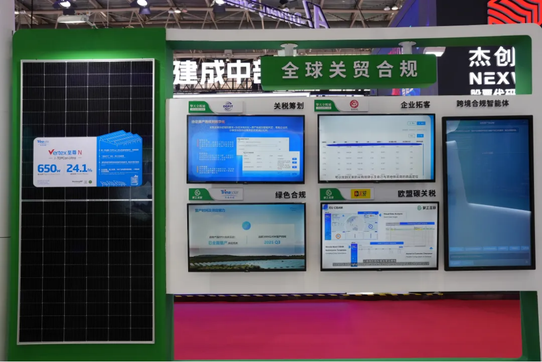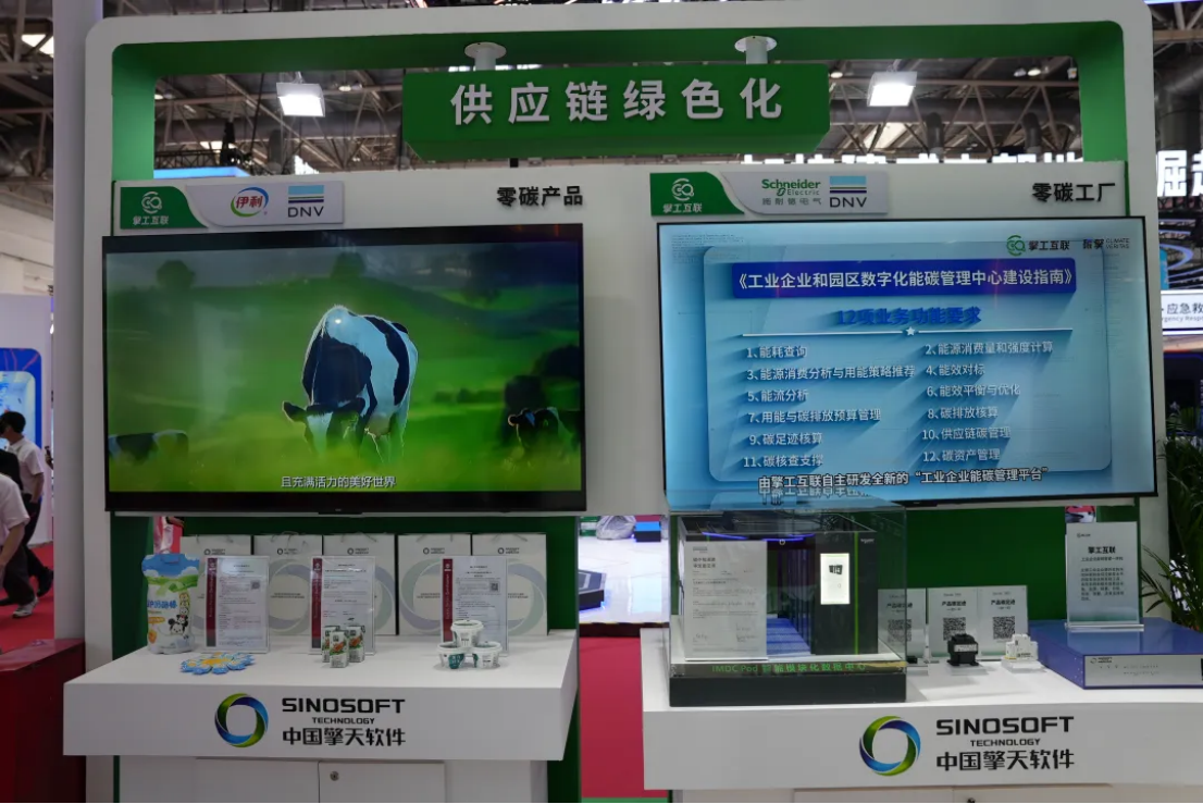 3.供應鏈綠色化。展區內展示了通過DNV認證的伊利零碳產品、施耐德供應鏈協同減碳等成功案例,陳列了天合光能光伏板、擎工互聯能碳一體機等實物展品,勾勒出擎天以綠色數字化能力助力企業“乘勢出海”的藍圖,讓“綠色競爭力”成為企業馳騁國際市場的鮮明標識。