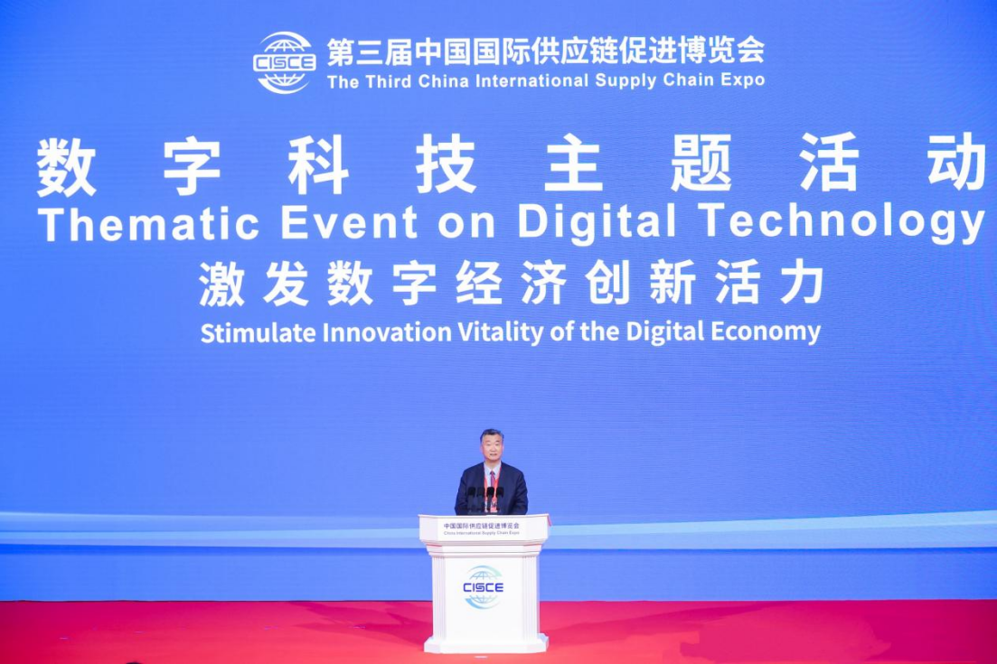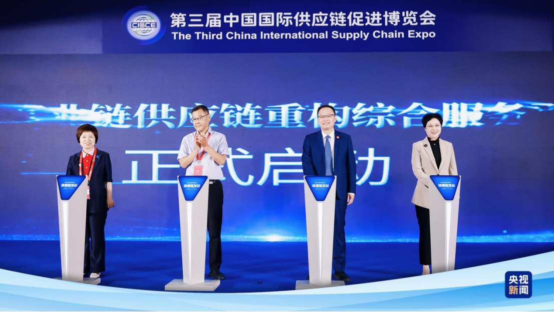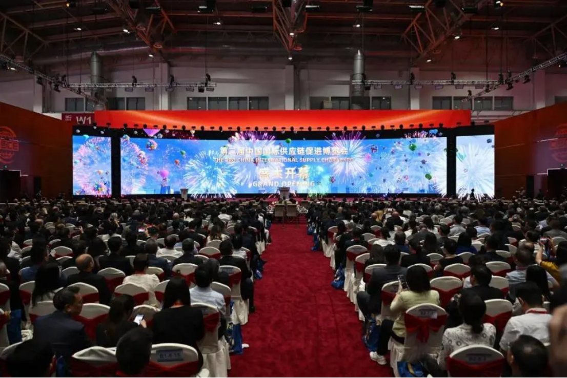 7月16日上午,第三屆中國國際供應鏈促進博覽會開幕式在北京成功舉辦。南非副總統保羅·馬沙蒂萊、泰國商業部常務副次長艾卡闡·斯達瓦拉瀾、美國英偉達公司創始人兼首席執行官黃仁勛、國際商會秘書長約翰·丹頓、英中貿易協會主席古沛勤、中國工商銀行董事長廖林現場致辭,來自世界100余個國家、地區和國際組織的政商學等各界代表1100多人出席開幕式。