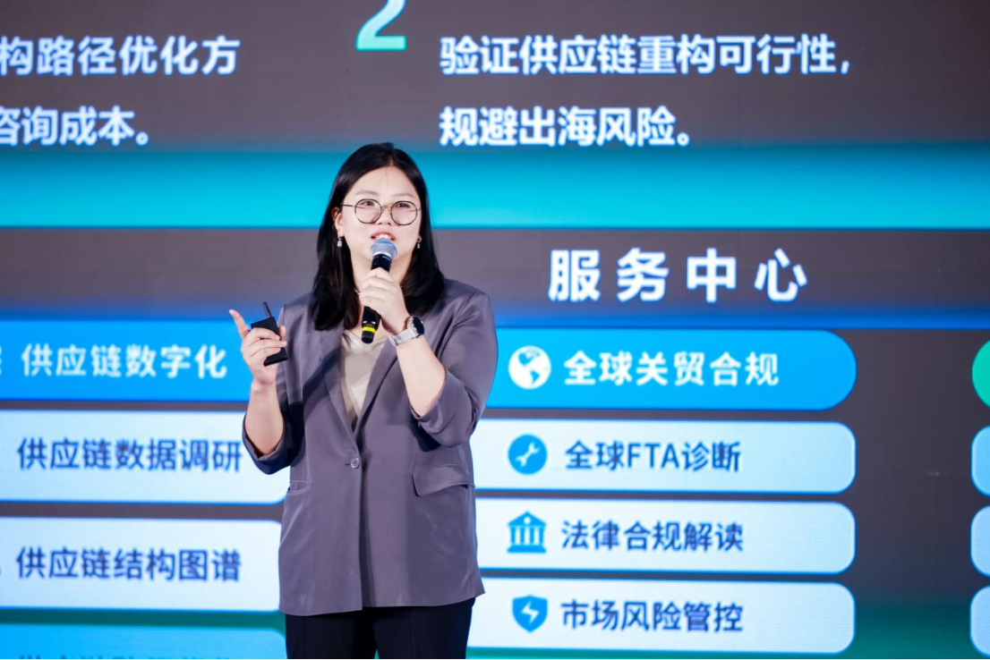 江蘇擎天工業互聯網有限公司副總經理陳妍珺詳細發布了解決方案,她介紹道:“依托擎天集團二十余載信息化能力積淀,我們將AI、大數據等前沿技術與產業場景深度融合,打造出這套‘以數促貿’的創新方案。它橫向覆蓋供應鏈數字化、全球關貿合規、供應鏈綠色化三大需求,縱向貫穿從路徑優化到合規執行的全流程,回應了產業升級的需求,破解了企業出海痛點。”陳妍珺表示,發布該解決方案,旨在為深陷合規迷霧、成本高企、綠色壁壘困境的貿易企業提供精準導航、優化路徑與破局之策,助力產業鏈韌性更足、協同更暢、根基更穩增強產業鏈韌性、協同性與穩定性。