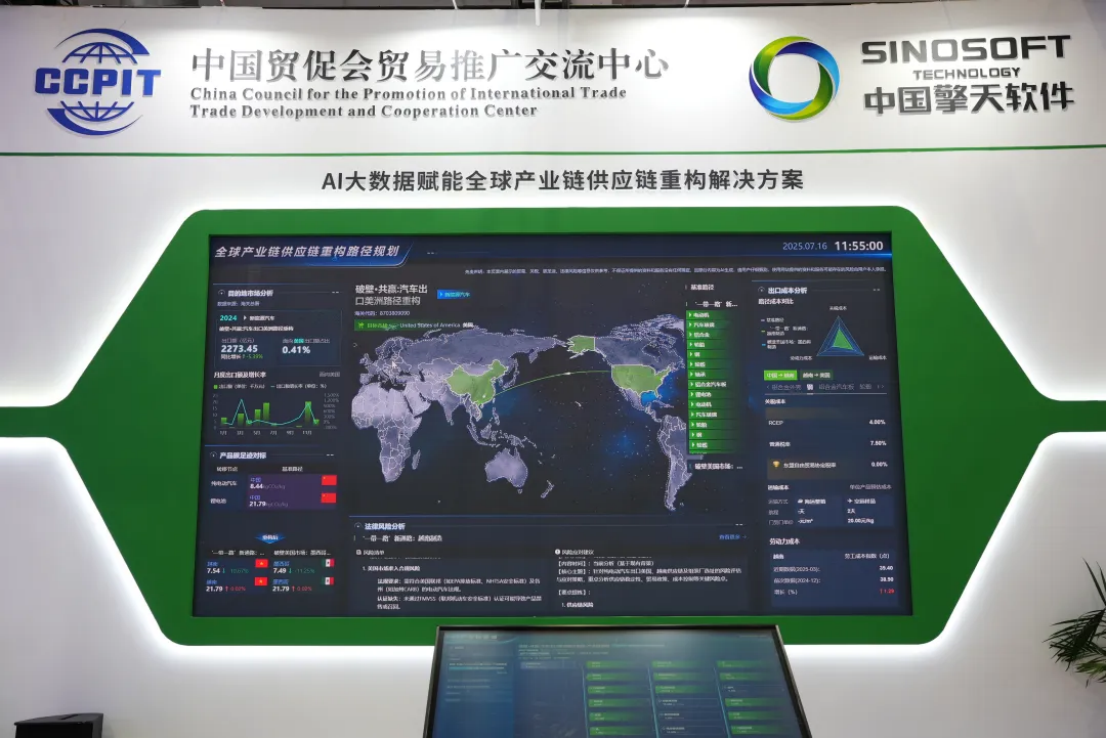 7月18日,擎天集團聯合中國貿促會貿推中心,在第三屆鏈博會現場,隆重舉辦“智鏈未來?數賦新篇——AI 大數據賦能全球產業鏈供應鏈重構解決方案”首發首秀活動。中國貿促會副會長李興乾、中國服務貿易協會會長張偉、擎天集團董事長辛穎梅致出席并致辭。